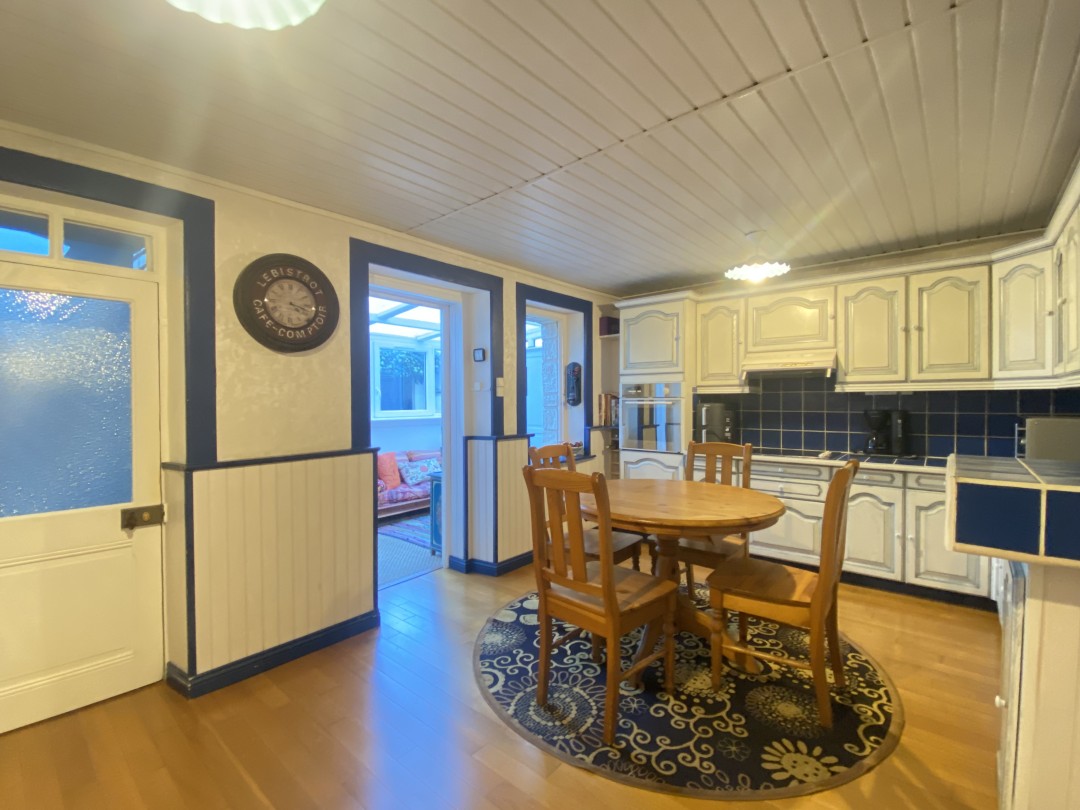 Elle dispose au rez-de-chaussée : d'un salon, d'une cuisine aménagée et équipée, d'une véranda ouvrant sur le jardin, d'une buanderie, d'un toilette, d'une salle d'eau, et d'un débarras avec grenier.